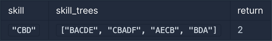 - skill_trees의 원소는 길이가 2 이상 26 이하인 문자열이며, 스킬이 중복해 주어지지 않습니다.